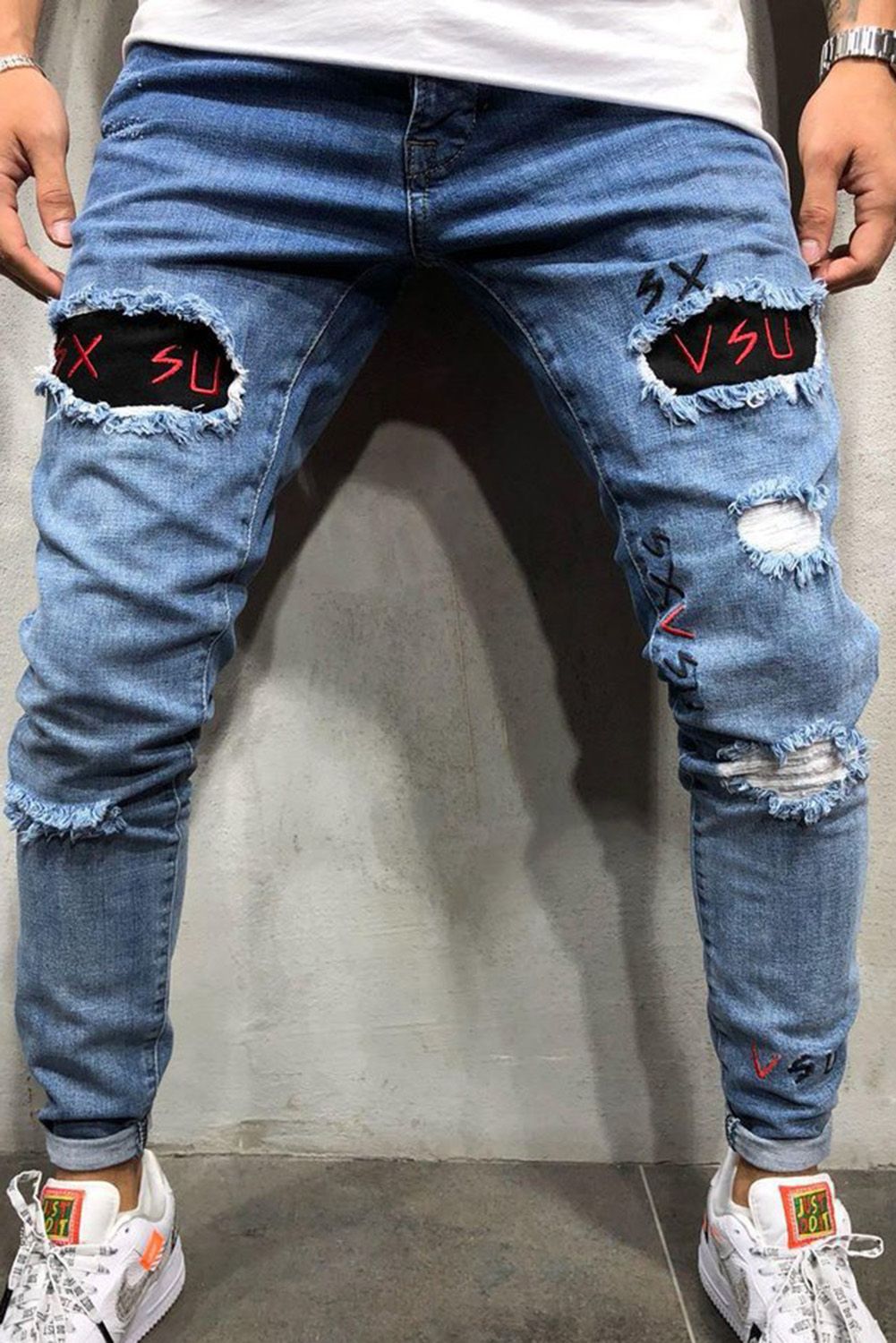 Men's Embroidered Ripped Jeans