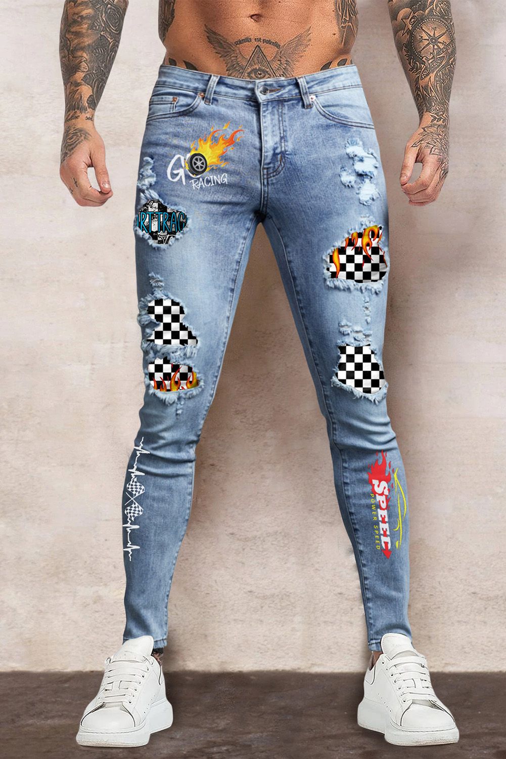 Sky Blue Go Racing Mens Checkerboard Rip & Repair Jeans