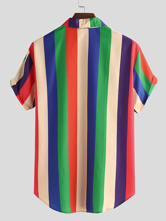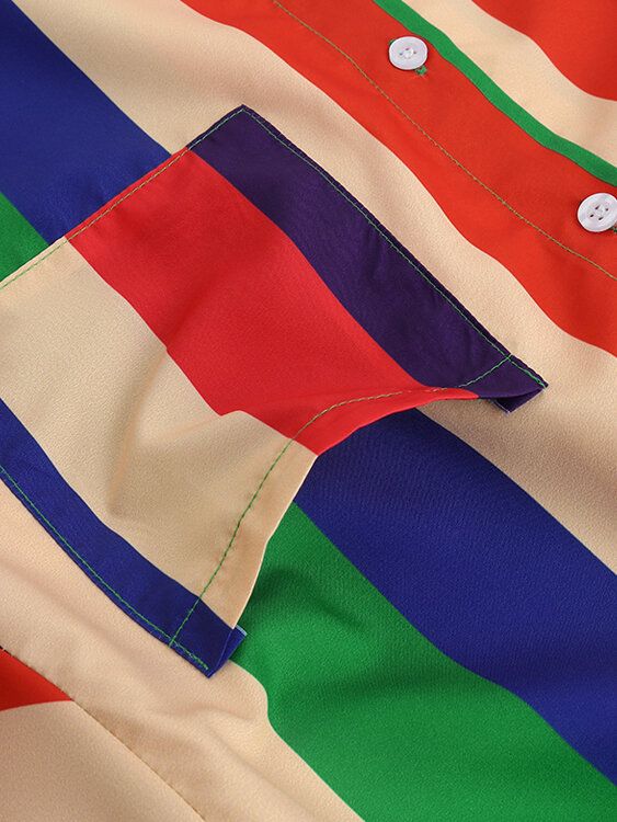 Mens Cool Rainbow Striped Patch Pocket Short Sleeve Shirts