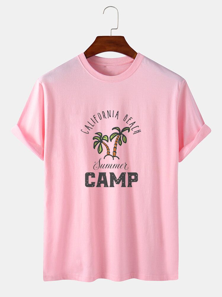 Mens Palm Tree Letter Print Cotton Short Sleeve T-Shirts