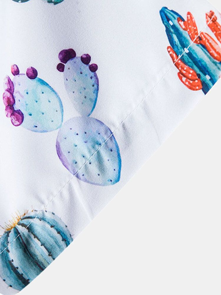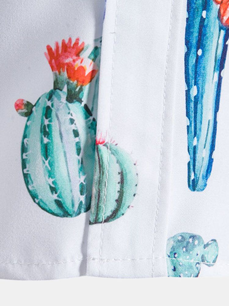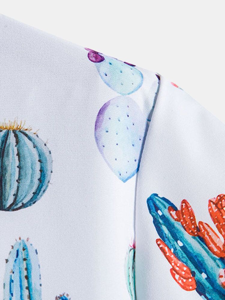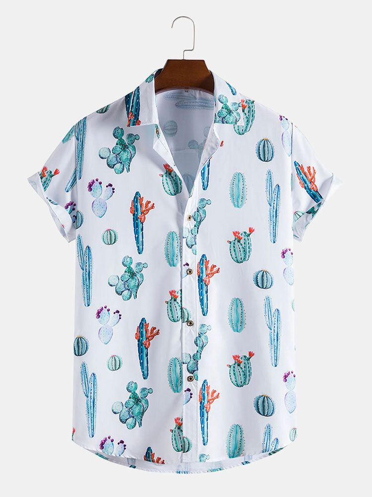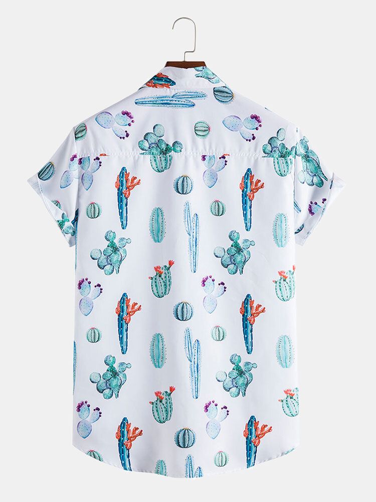 Mens All Over Cactus Pattern Lapel Short Sleeve White Shirt