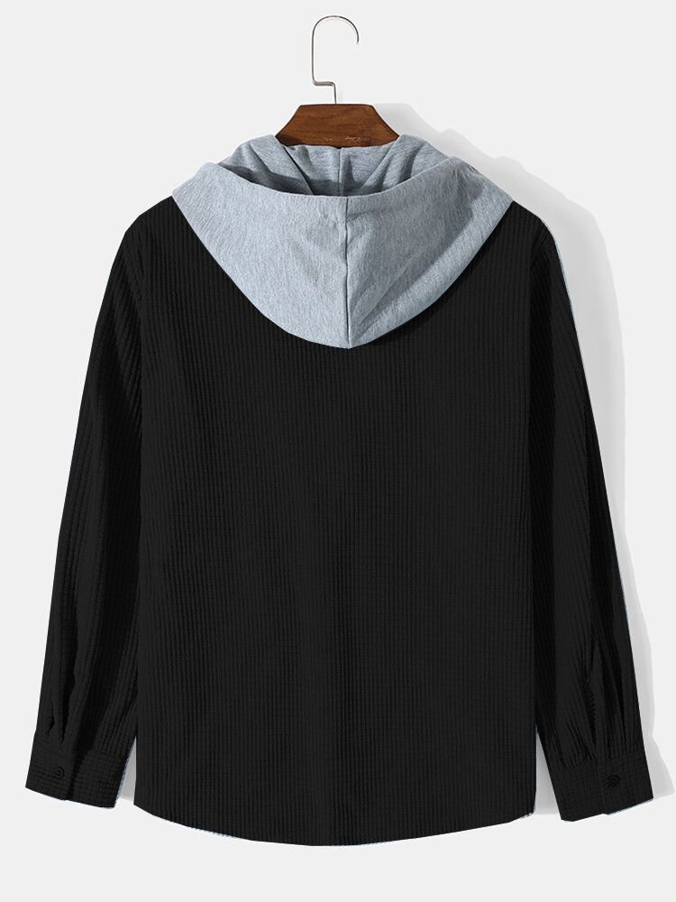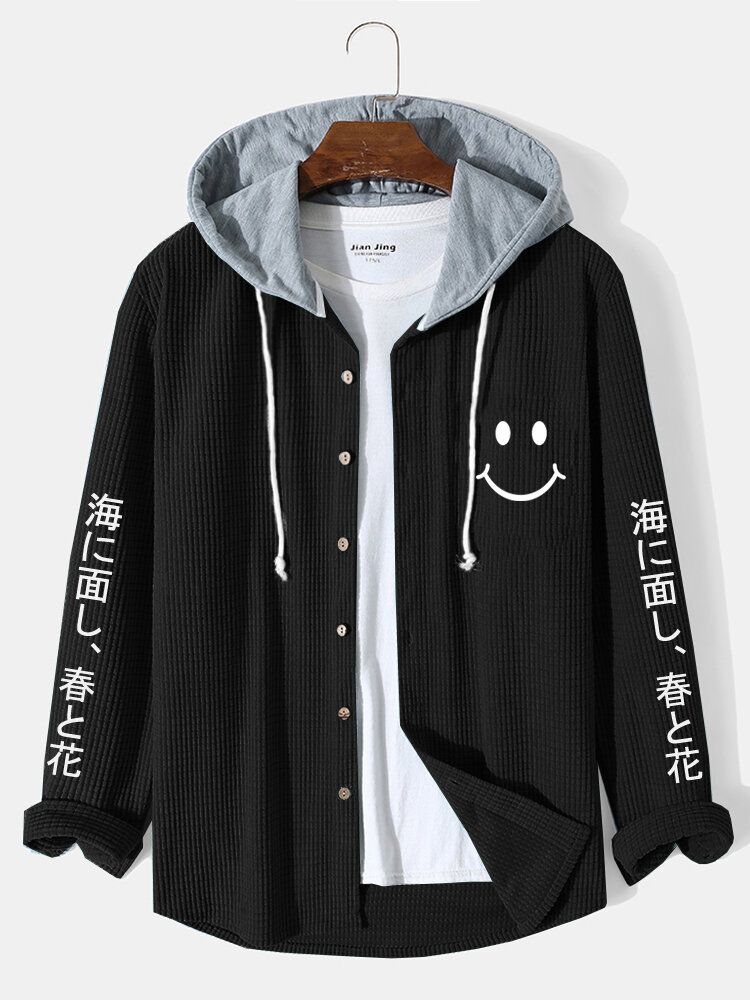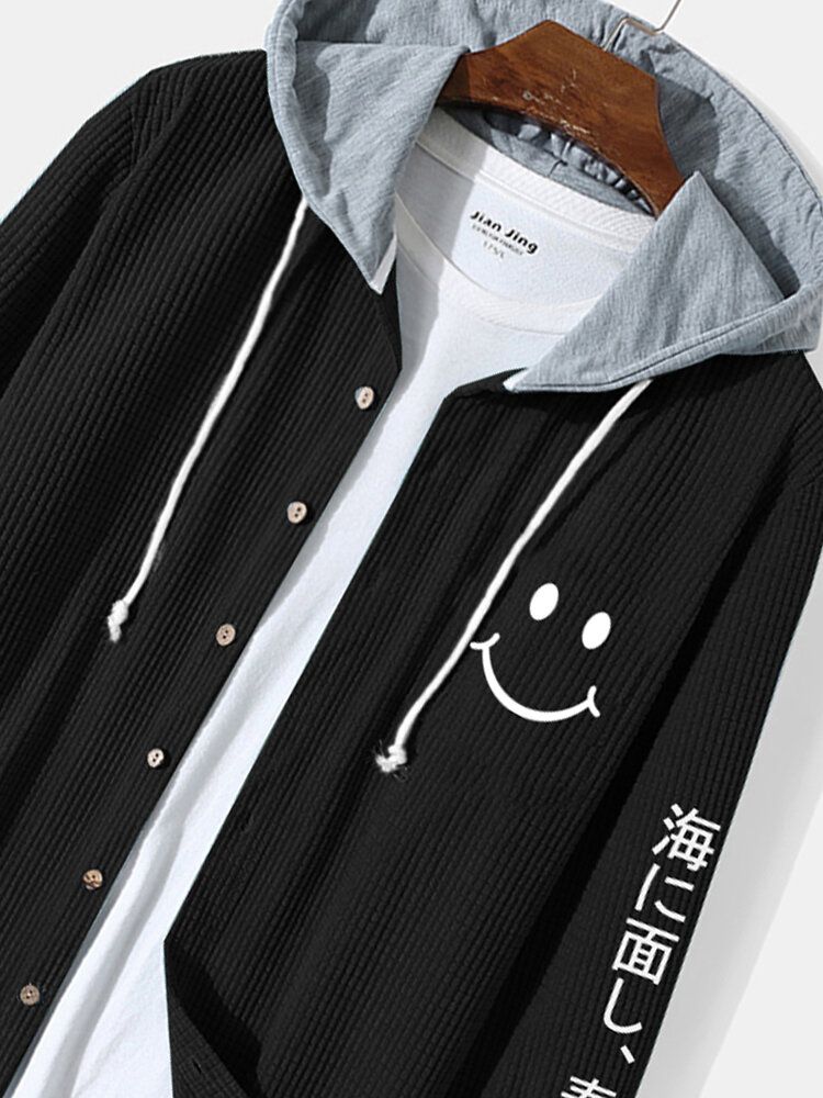 Mens Smile Face Japanese Embroidered Corduroy Long Sleeve Hooded Shirts