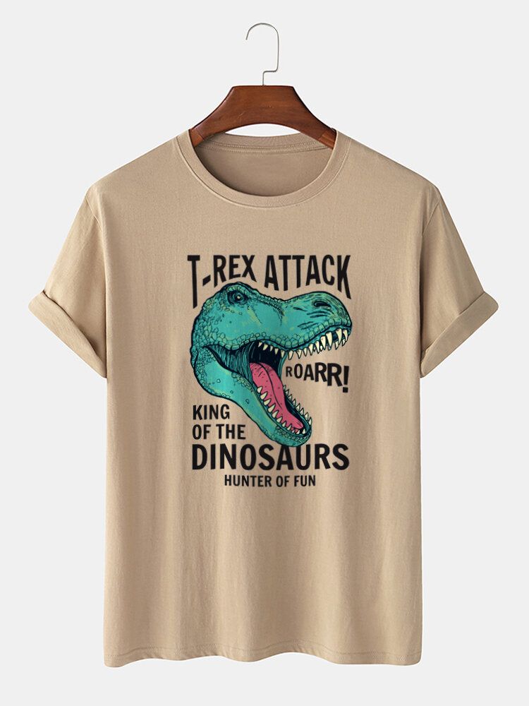 Mens Cartoon Dinosaur Letter Print O-Neck 100% Cotton Short Sleeve T-Shirts