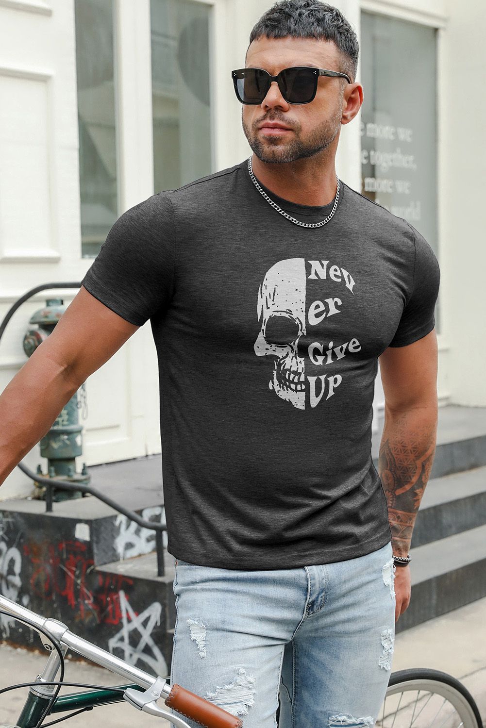 Never Give Up Skull Print Slim Fit Men's Graphic T Shirt