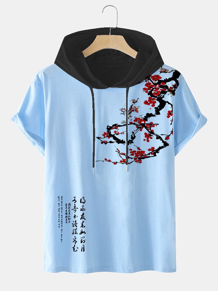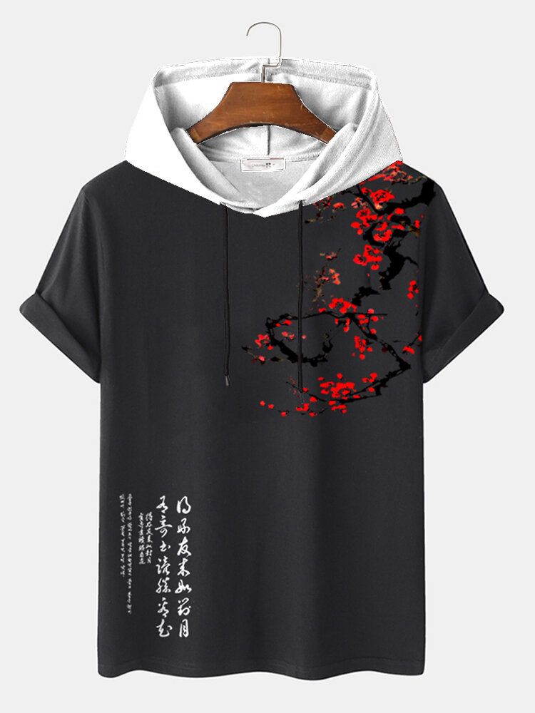 Mens Plum Bossom Character Print Contrast Short Sleeve Hooded T-Shirts