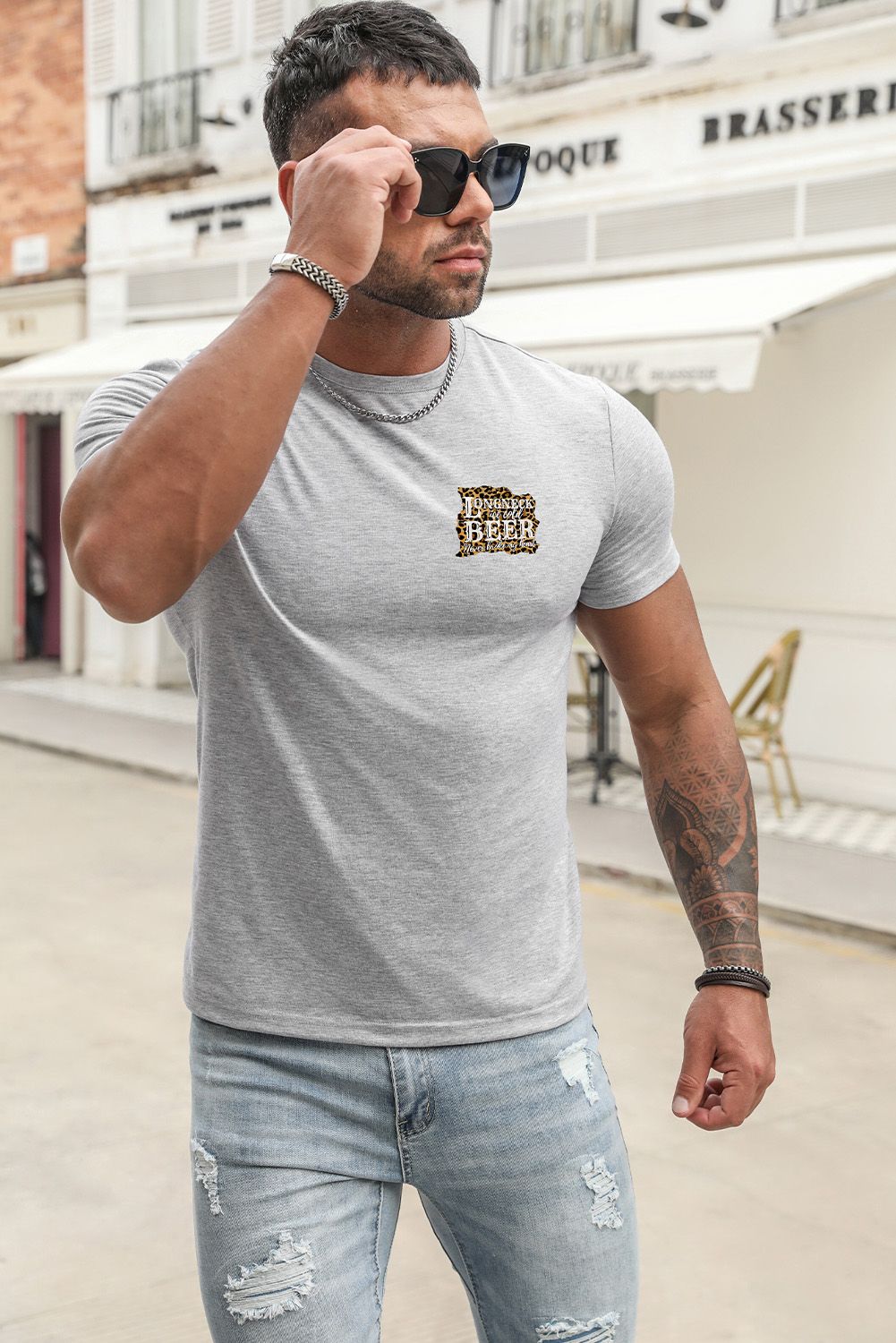Gray Men's Crew Neck T-shirt with Leopard Letters Print