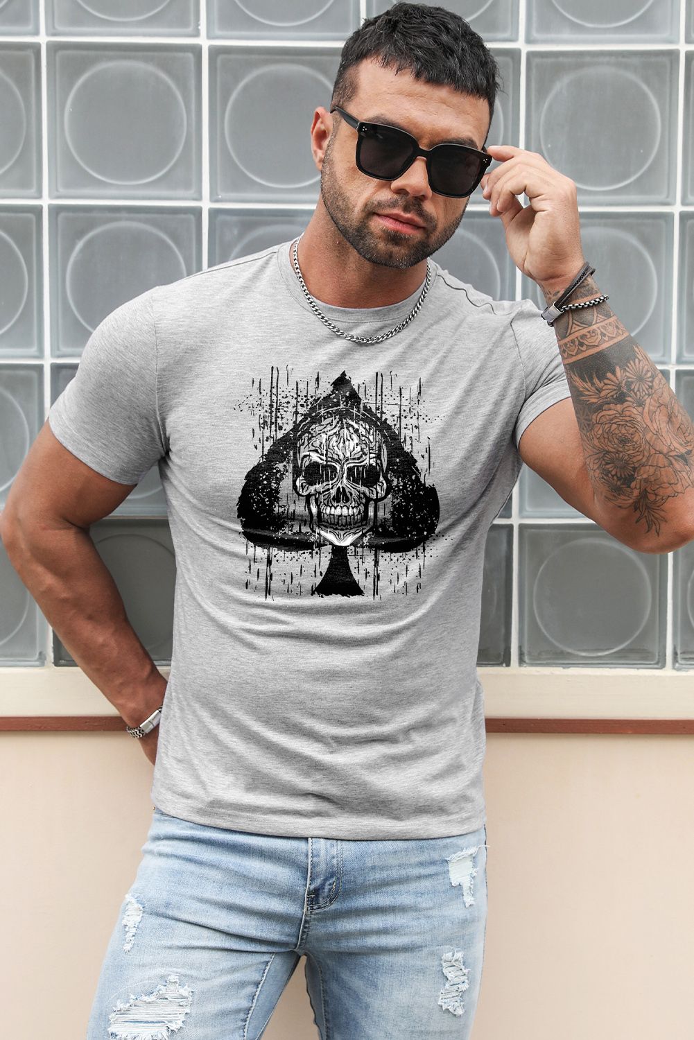 Gray Skull Spade Print Short Sleeve Men's Graphic Tee