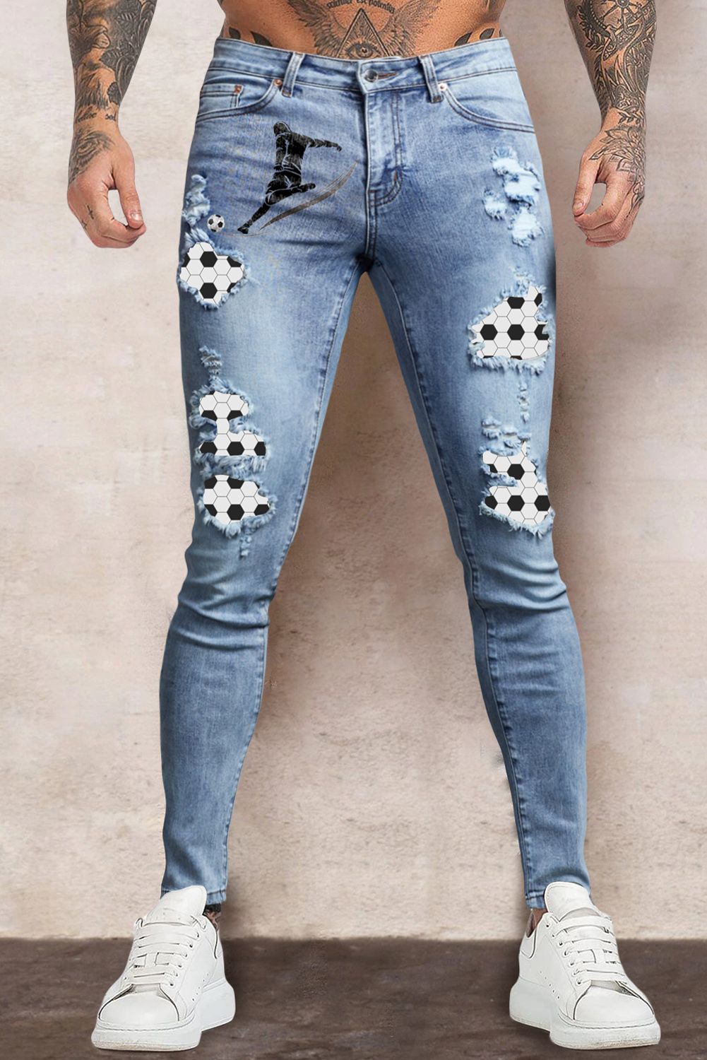 Sky Blue Soccer Print Splicing Skinny High Waist Men's Jeans